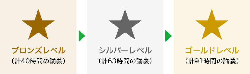 ブロンズレベルはブロンズ1(約12時間)、ブロンズ2(約13時間)、ブロンズ3(約15時間)の合計約40時間、シルバーレベルは1日あたり7時間×3日間×3段階で63時間、ゴールドレベルは1日あたり7時間×3日間×3段階の63時間と最終認定試験のための4日間28時間を加え計91時間を受講していただく必要があります。星を1つ獲得すると次のレベルに進むことができます。